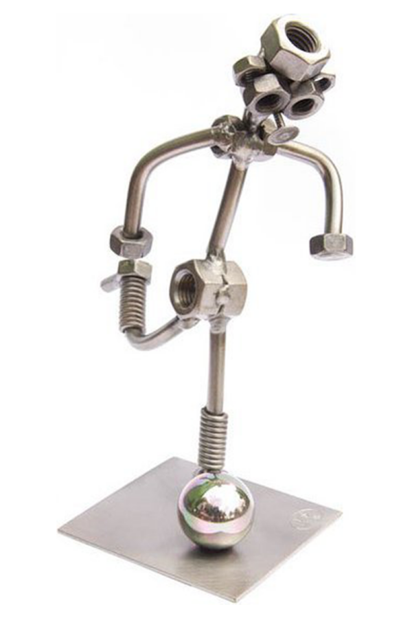 Originální kovová figurka Fotbalista ručně vyrobená z běžných strojních materiálů (matek, šroubů apod. – vše leštěný lakovaný kov). Úplné rozměry: 7 x 7 x 17 cm