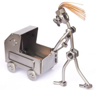 Originální kovová figurka Maminka s kočárkem z kategorie Činnosti ručně vyrobená z běžných strojních materiálů (matek, šroubů apod. – vše leštěný lakovaný kov). Úplné rozměry: 21 x 7 x 17cm.