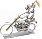 Originální kovová figurka Motorka Duo ručně vyrobená z běžných strojních materiálů (matek, šroubů apod. – vše leštěný lakovaný kov). Úplné rozměry: 21 x 8 x 19 cm