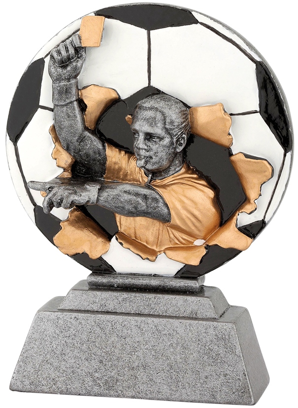 3D zlato-stříbrná plaketa s fotbalovým rozhodčím na podstavci. Výška 13 cm.