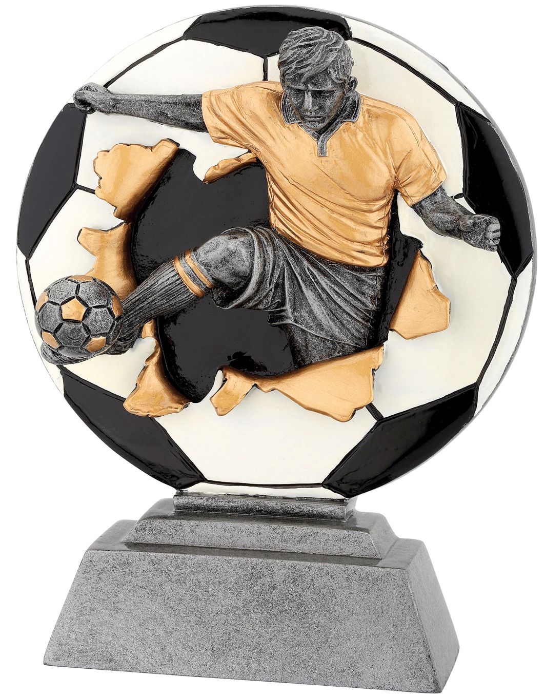 3D zlato-stříbrná plaketa fotbalového hráče s míčem na podstavci vysoká 10 / 13 / 16 / 18 / 20 / 23 cm.